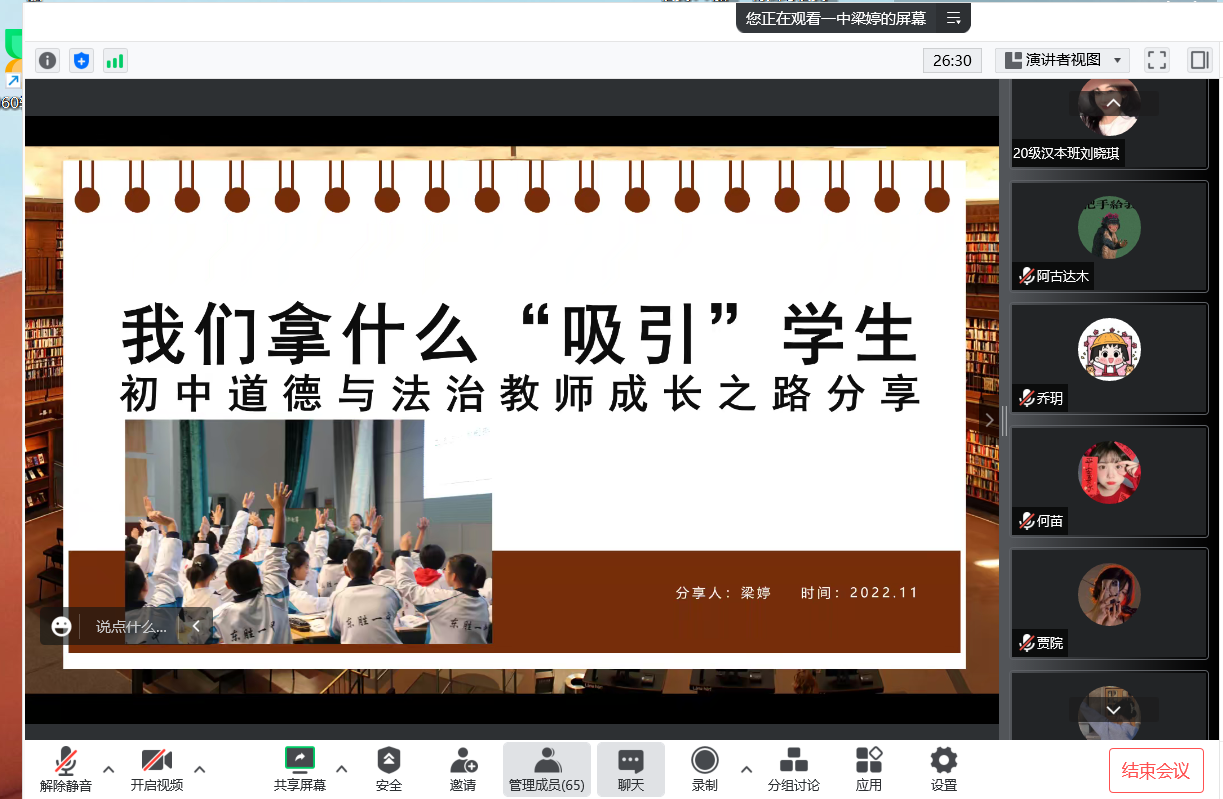 为了更好适应教育部师范类专业认证的新要求,进一步加强专业建设,11月5日,beat365正版唯一官网必一组织开展“中学政治教师素质养成”系列讲座的第二讲,邀请到鄂尔多斯市东胜区第一中学梁婷老师为学院学生作“初中道德与法治教师成长之路分享”线上主题讲座。讲座由学院吴娇老师主持,学院全体学生在线参加。
