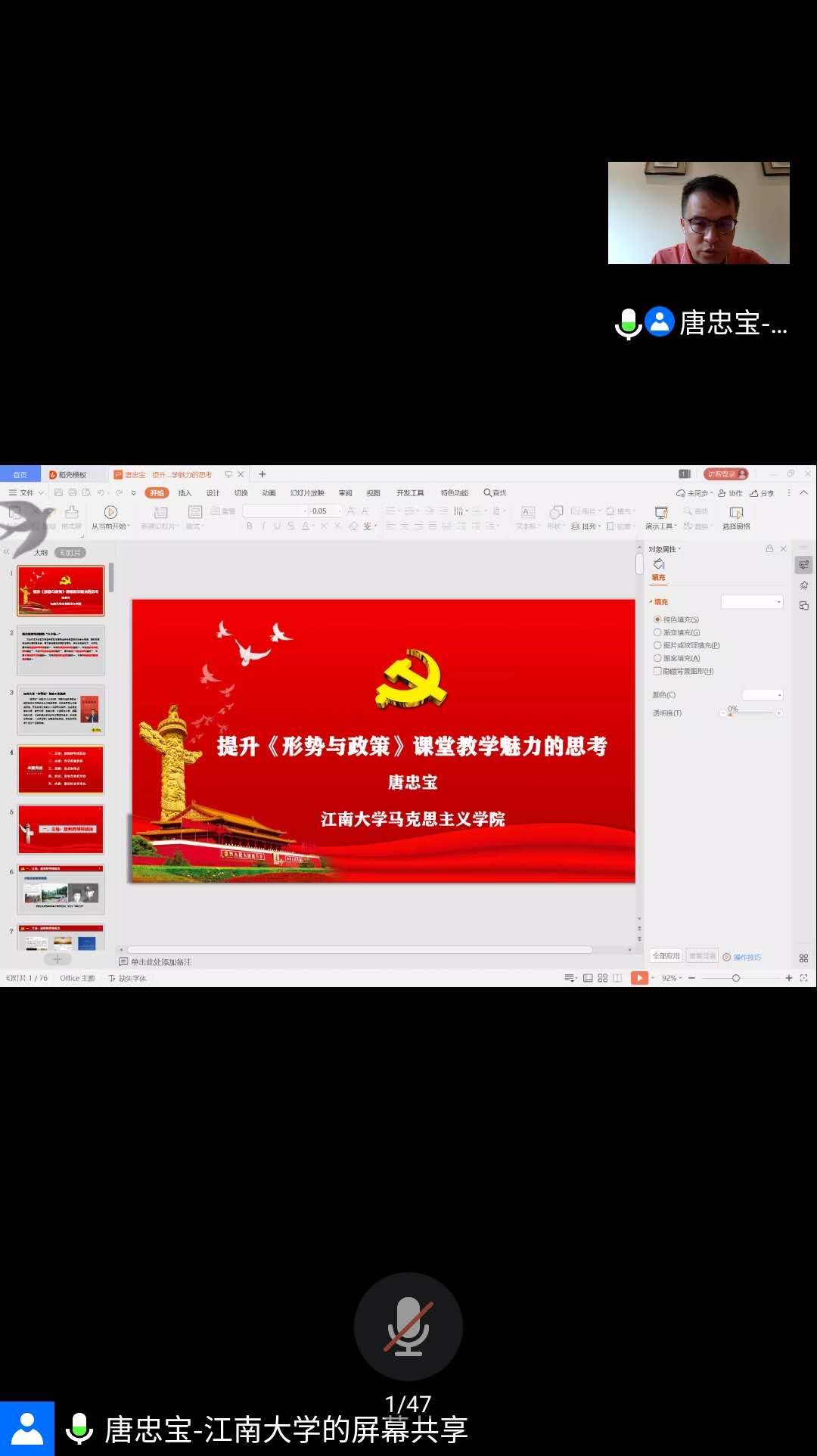 7月7日下午两点半,beat365正版唯一官网必一“形势与政策”课程组教师通过腾讯会议参加了由内蒙古师范大学主办的内蒙古思政课教师同备一门课——形势与政策课线上集体备课活动。本次活动聘请了江南大学beat365正版唯一官网必一教授、哲学博士,教育部首批思政工作精品项目“宝哥说”思政文化育人品牌主讲人唐忠宝教授作了题为“提升《形势与政策》课堂教学魅力的思考”的精彩讲座。