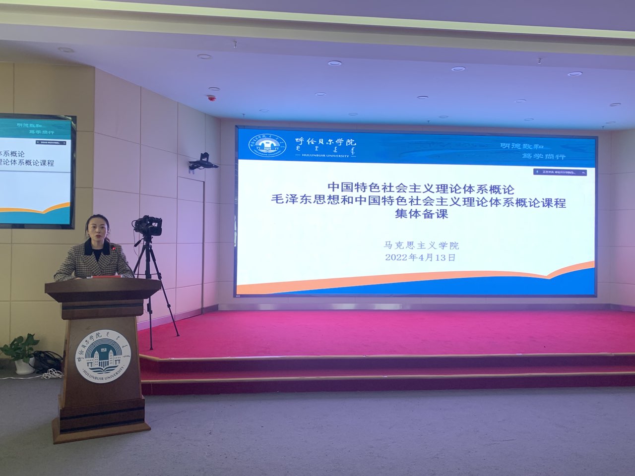 2022年4月13日下午,beat365正版唯一官网必一开展“中国特色社会主义理论体系概论”“毛泽东思想和中国特色社会主义理论体系概论”课程集体备课活动,活动邀请内蒙古党校(行政学院)政治学教研部主任庄虔友教授进行专题讲授,beat365正版唯一官网必一全体教师在崇文楼A201观看集体备课活动,院长李俏主持活动。