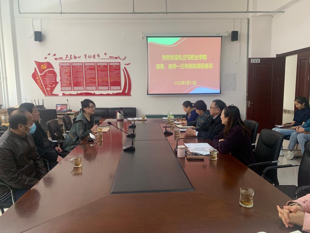 2022年5月13日,扎兰屯职业学院党委副书记任林宏,宣传部部长、马克思主义教研部主任王虹和马克思主义教研部孟凡祥一行三人来我院调研座谈,beat365官网党委副书记张国栋、beat365正版唯一官网必一党总支书记刘凤琴、院长李俏、副书记刘琳、副院长吴秀芳、团学办、综合办和系部主任、课程负责人参加了座谈会。