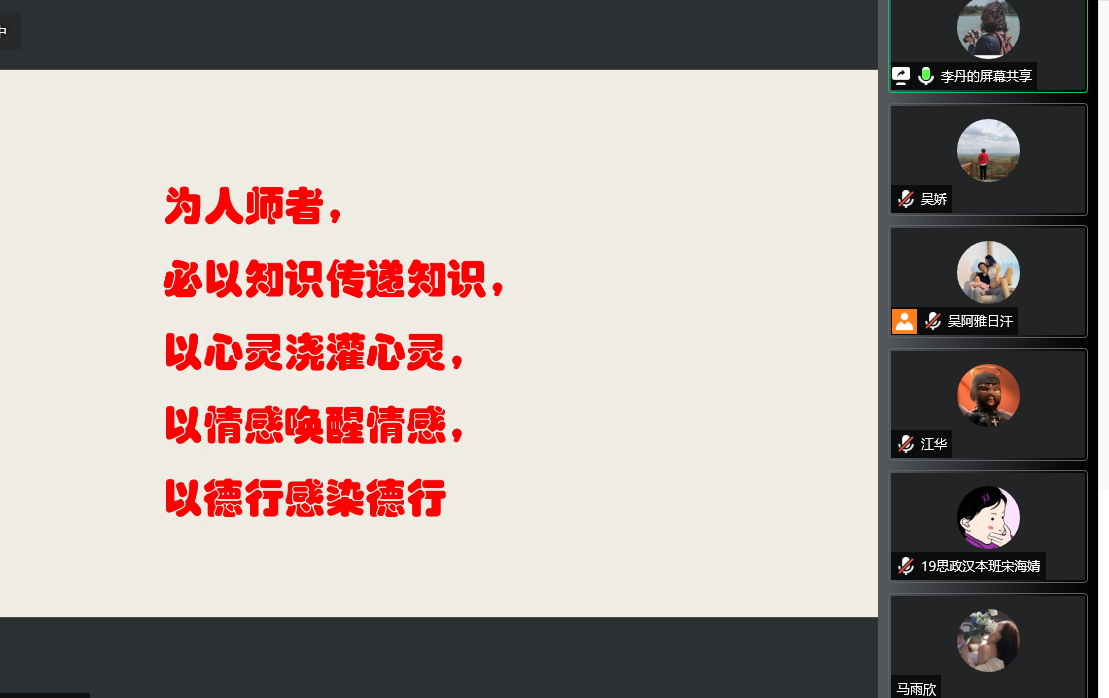 为学习贯彻落实习近平总书记在中国人民大学重要讲话精神,推进大中小学思政课一体化建设,进一步落实实践教学工作要求,提升思想政治教育专业师范生教学技能,beat365正版唯一官网必一举行大中小学校《习近平新时代中国特色社会主义思想学生读本 》示范课课例展示及研讨活动系列的第二讲。5月20日下午,我院邀请海拉区实验高级中学思政课教师李丹为2019级、2020级全体同学做题为《育人为本 提升素养》的线上讲座。本次会议由beat365正版唯一官网必一实习实训中心主任吴娇主持。