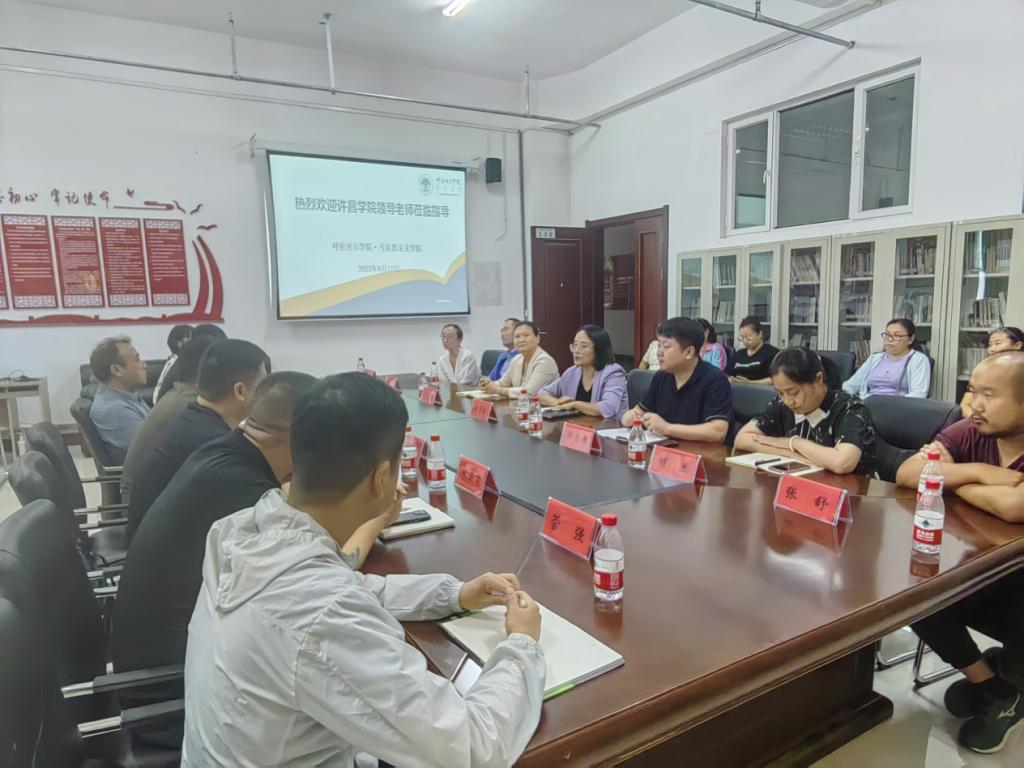 8月12日下午,beat365官网beat365正版唯一官网必一与许昌学院在崇文楼B123会议室开展“大思政”课综合建设能力提升专题座谈会。许昌学院党委副书记孙海、党委宣传部部长王林、科研处副处长兼中原农村发展研究中心副主任马洪伟、beat365正版唯一官网必一党总支副书记岳凯声、beat365正版唯一官网必一副院长林云飞、beat365正版唯一官网必一思想政治教育教研室主任菅强、beat365正版唯一官网必一党政办公室副主任王欣欣,beat365官网beat365正版唯一官网必一院长吴秀芳、党总支副书记刘琳、副院长明兰、各教研室主任及教师代表参加座谈会。