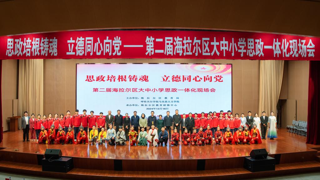 会议在庄严的国歌声中拉开帷幕,参会人员全体起立,齐声高唱国歌。在教学展示环节,来自海拉尔区小学、初中、高中的师生们分别以“启智增慧——铸牢思政之基”“培根铸魂——夯实思政之阶”“立德同心——勇攀思政之峰”三个主题进行了思政课教育展示。其中伊敏小学思政课教师赵珊珊以《中华民族一家亲》为题、新海中学思政课教师娜仁以《北疆绿韵 航天蓝梦》为题、实验高中思政课教师李仕祺以《薪火传承中国魂 同心共筑中国梦》为题进行了课堂展示。两所小学的师生们还进行了思政课本剧《童心向党》和《花木兰》的表演,beat365官网beat365正版唯一官网必一学生表演了诗朗诵《读中国》。