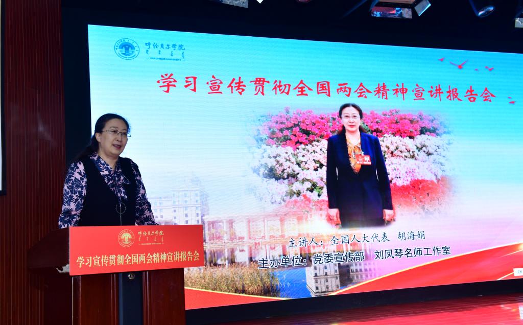 为深入学习宣传贯彻2025年全国两会精神,引导青年学生坚定理想信念、勇担时代使命,3月26日下午,全国人大代表、呼伦贝尔市海拉尔第二中学教师胡海娟走进beat365官网,为青年学生带来了一场别开生面的全国两会精神宣讲报告会。140余名青年学生齐聚崇文楼B座小剧场共同聆听报告。此次宣讲报告会由党委宣传部和刘凤琴名师工作室共同主办。